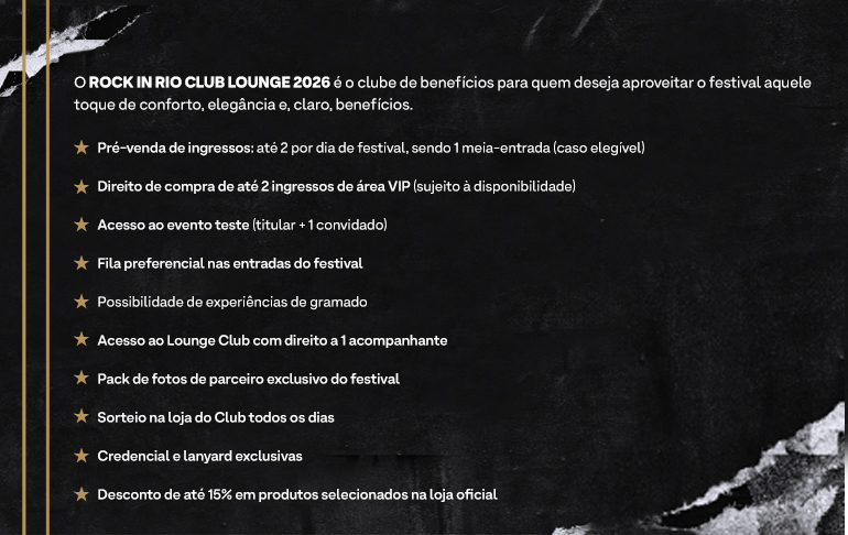 Os associados Rock in Rio Club na categoria Rock in Rio Club Rock Star 2026 têm direito a levar 1 (um) convidado para o Lounge exclusivo Rock in Rio Club com ar-condicionado, lugar para descansar, rooftop, banheiros, bares, telão e diversas ativações.