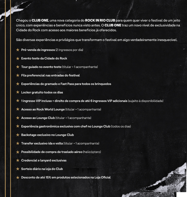 (*) A ROCK WORLD S.A. passou a ser a organizadora do Rock in Rio, a partir da edição de 2013, relativos ao Programa Rock in Rio Club. Todas as dúvidas, comentários e reclamações devem ser dirigidos à ROCK WORLD S.A. por meio dos canais indicados no regulamento.
