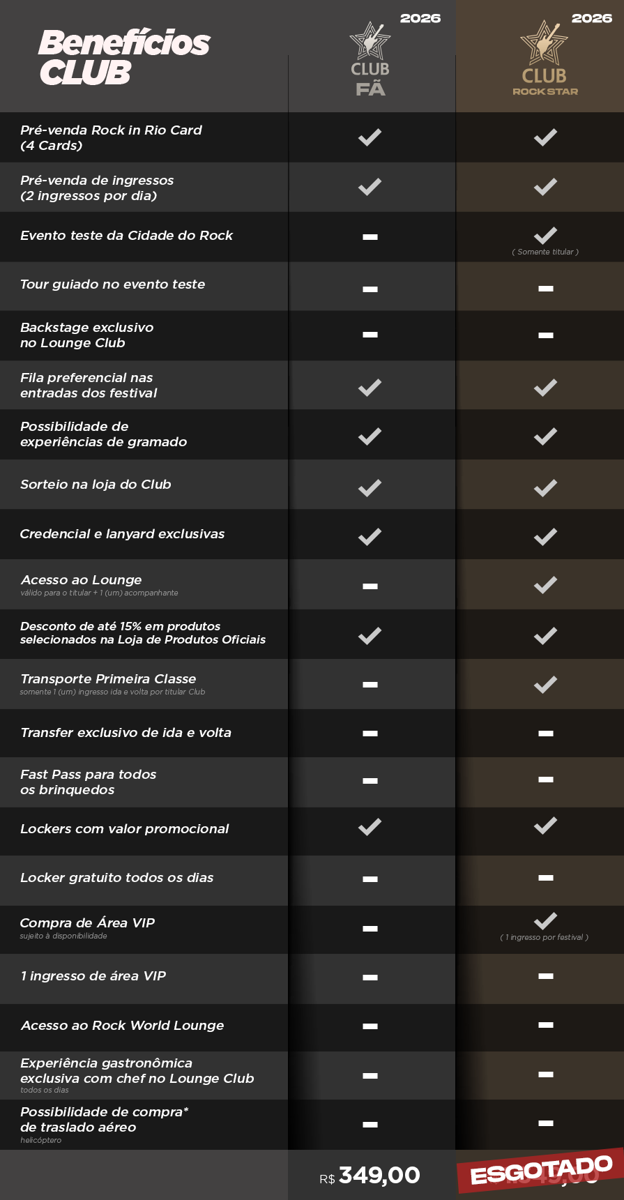 Inicialmente, teremos duas categorias: Rock in Rio Club Fã 2026, Rock in Rio Club Rock Star 2026.